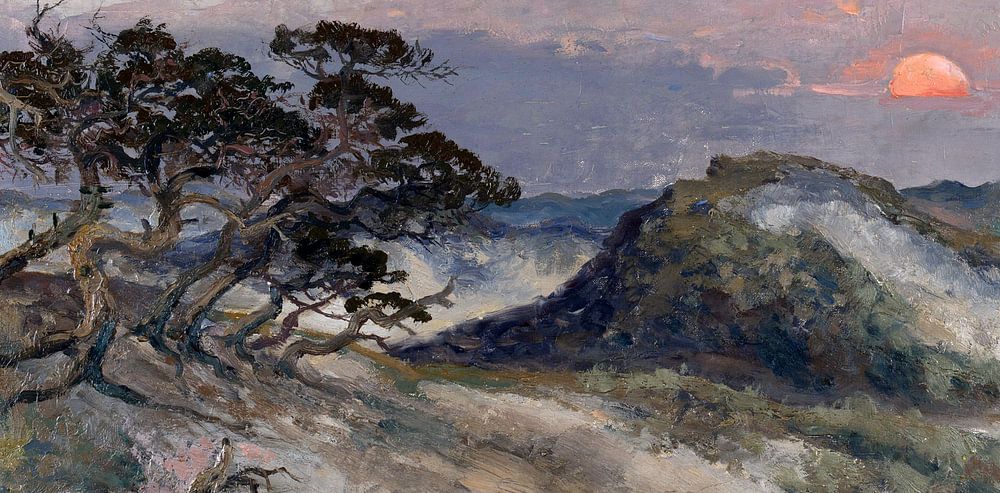 Die Dünen von Wassenaar mit der Skyline einer Stadt im Hintergrund. Einige Bäume wachsen auf der vorderen Düne. Im Hintergrund sehen wir den Sonnenaufgang.