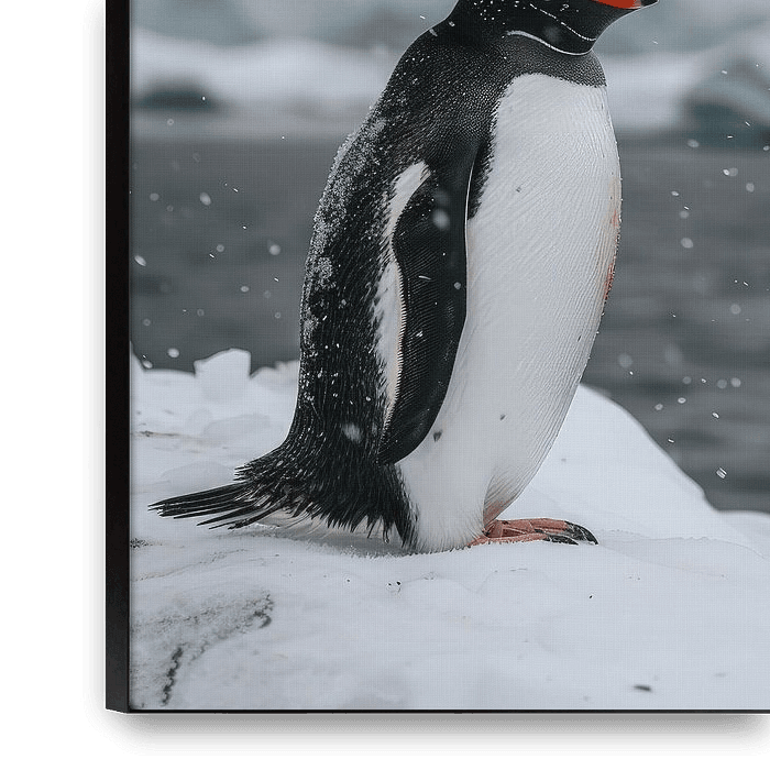 Dieses Kunstwerk zeigt einen Pinguin, der still auf einem verschneiten Felsvorsprung steht, während Schneeflocken sanft vom grauen Himmel fallen.
