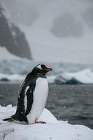 Der Hintergrund besteht aus Eisbergen und dunklen Felsformationen, die im Nebel verschwinden und ein Gefühl von Isolation und Weite hervorrufen. Der Pinguin mit seinem schwarz-weißen…