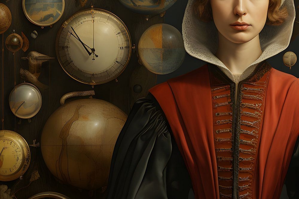 In einem surrealen Renaissance-Gemälde im Stil von Fans Hals ist eine wohhabende Frau dargestellt, die von einer Vielzahl von Globen und Uhren umgeben ist. Die Szene spielt sich in einem fantastischen Raum ab, der mit skurrilen Elementen wie schwebenden Globen und verzerrten Uhren gefüllt ist. Die reiche Frau strahlt eine Mischung aus Eleganz und Geheimnis aus. Die Darstellung der Globen und Uhren verleiht dem Gemälde eine mysteriöse und zeitlose Atmosphäre, die typisch für den einzigartigen Stil von Fans Hals ist.
