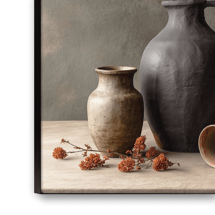 Getrocknete Stängel und Lampionblumen stehen in robusten, erdigen Gefäßen. Die Skulptur strahlt Ruhe, Einfachheit und die Schönheit des Vergänglichen aus.