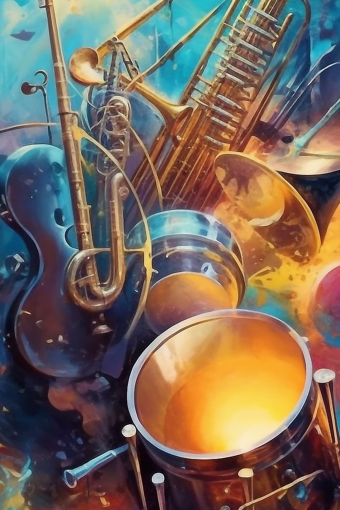 Speziell für die Musikliebhaber unter den Besuchern habe ich mir eine Serie ausgedacht und sie mit der Midjourney Ai-art Software auf den Befehl "The Essence of Music" ausführen lassen. Außerdem ist das Ergebnis aller Berechnungen einigermaßen überschaubar, wenn man jedes Instrument an die richtige Stelle im Text setzt. Jede Band hat diese Grundkonfiguration auf der Bühne. Manchmal mit dem Zusatz von anderen Instrumenten.