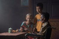 Zwei Großeltern mit ihrem Enkel an einem Tisch, die über einen Artikel in einer Zeitschrift diskutieren. Szene in einem einfachen Haus in Java, Indonesien.