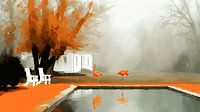 Bestelle dieses abstrakte Wandbild Die Flamingos am Herbstpool von KRAB als Kunstdruck auf Leinwand, Alu-Dibond, als Poster, Fototapete oder Acrylglasbild.