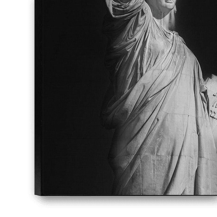 Ein 1:1-Foto der Freiheitsstatue in Schwarz-Weiß.