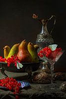 Intimes Stillleben, inspiriert durch den Stil der alten Meister. Sie sehen eine Zinnfruchtschale auf Beinen, die 5 Birnen enthält, von denen 1, gerade in der Mitte, eine rote Röte hat. Ganz links sehen Sie rote Beeren auf einer antiken englischen blauen Platte und ein Detail; eine kleine blaue Flachsblume. Vorne rechts sehen Sie ein…