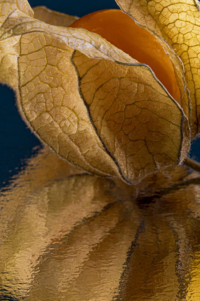 "Goldberry (Physalis) öffnet sich" ist ein Makrofoto einer Goldberry (auch Ananaskirsche oder Physalis peruviana genannt), bei der die Hülle getrocknet ist und sich teilweise geöffnet hat. So kann man die schöne Aderstruktur sehen (teilweise durch die Beleuchtung verstärkt).