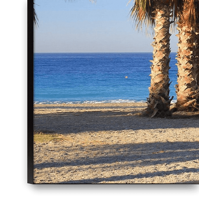 Eine Gruppe von Palmen am Strand von Almuñecar. Ein Fußweg führt zu den Palmen und dem Meer.