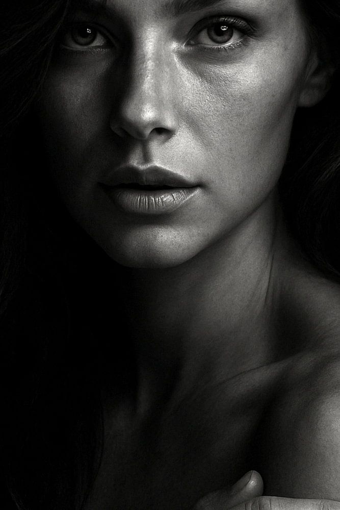 Dieses kraftvolle Schwarz-Weiß-Porträt strahlt Emotion, Geheimnis und zeitlose Schönheit aus. Der Blick des Modells ist durchdringend und fast hypnotisch, wodurch dieses Kunstwerk sofort die Aufmerksamkeit auf sich zieht. Die subtile Platzierung der Hand auf der Schulter verleiht eine menschliche Verletzlichkeit, die perfekt mit dem starken, selbstbewussten Blick des Gesichts harmoniert.