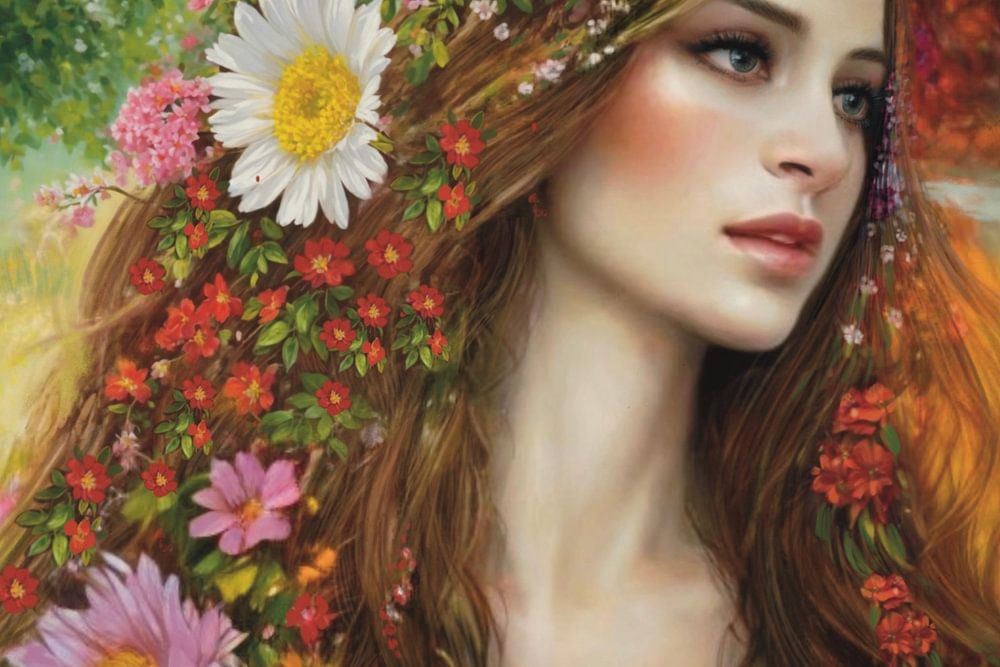 Diese Zeichnung zeigt eine Frau mit natürlichem Aussehen, deren langes braunes Haar mit Blumen geschmückt ist.