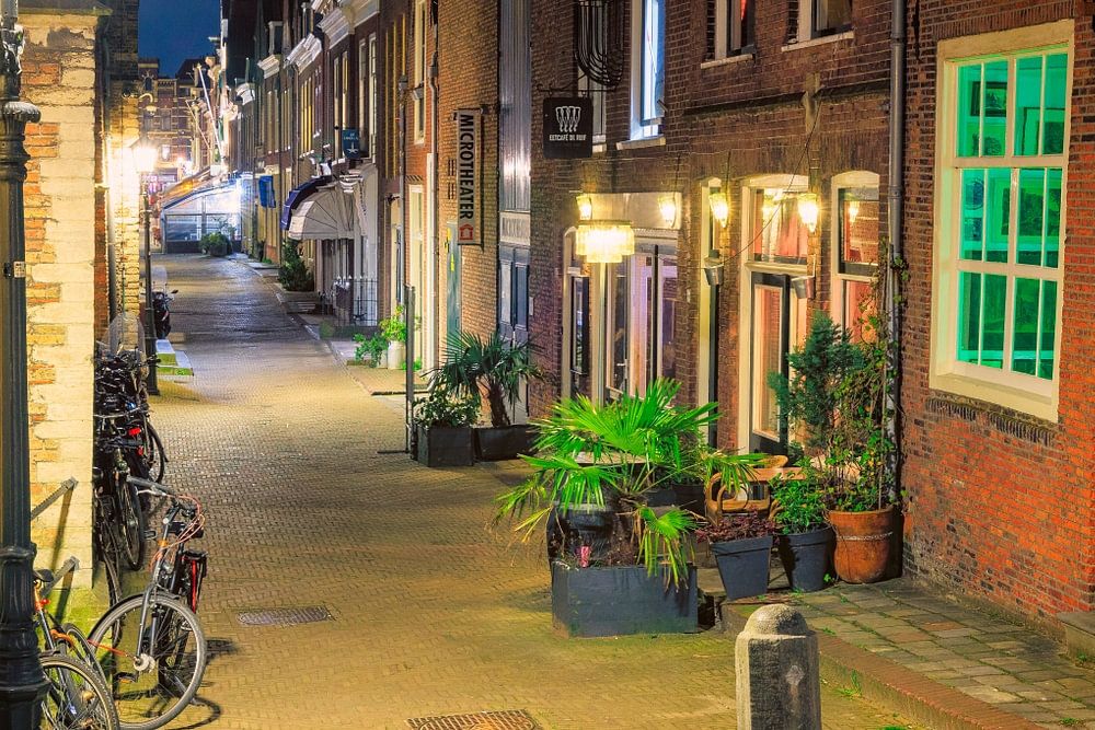 Über "Die Kerkstraat in Delft bei Nacht, neben der berühmten Kirche Nieuwe Kerk."