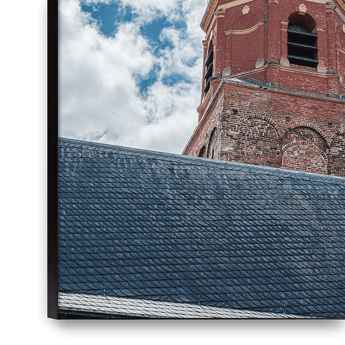 Bestelle dieses Landschafts-Wandbild Die Kirche St. Lambertus vor blauem Himmel von Iryna Melnyk als Reproduktion auf Leinwand, Alu-Dibond, als Poster, Fototapete oder Acrylglasbild.