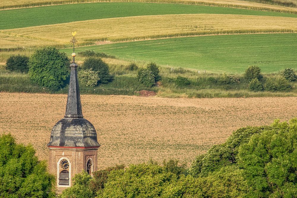 Blick auf den Kirchturm von Eys mit Mohnfeldern im Vordergrund und den südlimburgischen Hügeln im Hintergrund