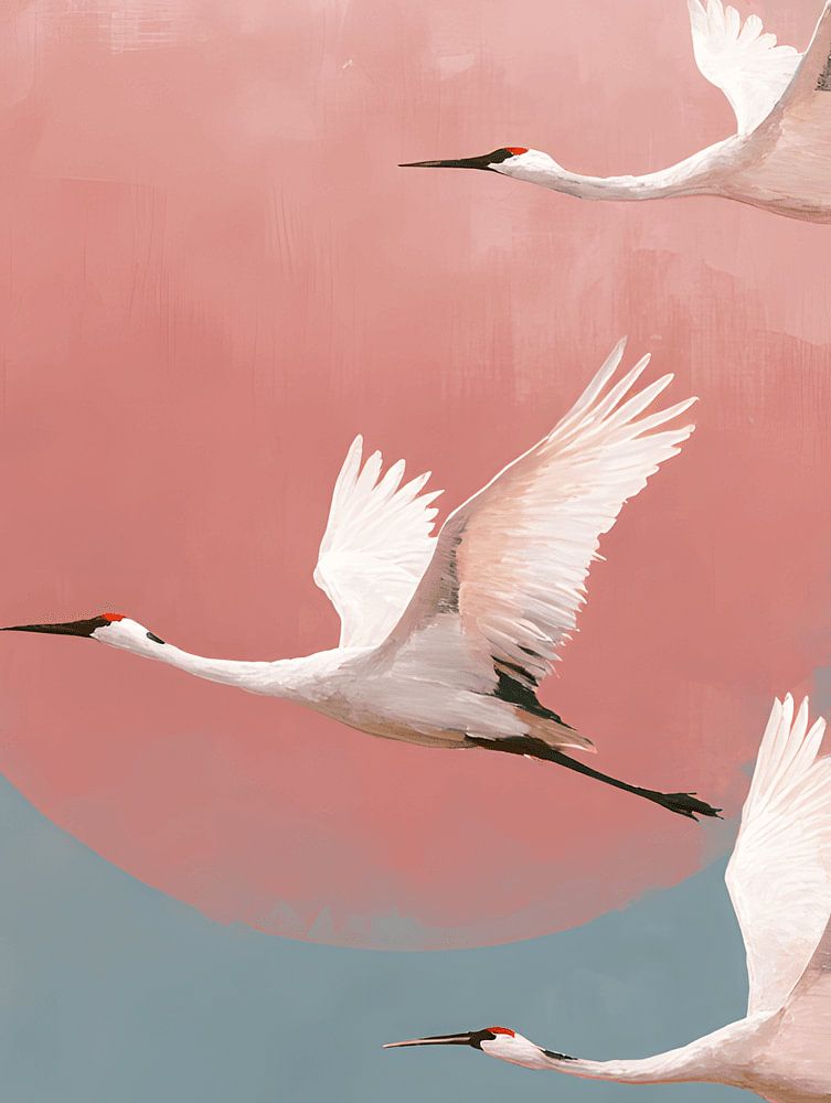 In diesem Kunstwerk werden die Kraniche in einer Mischung aus schönen Farben und Schattierungen zum Leben erweckt, die sich wunderbar vermischen und eine heitere Atmosphäre hervorrufen.