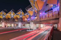 Erleben Sie die einzigartige Synergie zwischen ikonischer Architektur und pulsierendem Stadtleben in dieser faszinierenden Nachtaufnahme. Während der Abendverkehr in vollem Gange ist, werden die weltberühmten Kubushäuser von Piet Blom zur stimmungsvollen Kulisse für ein atemberaubendes Schauspiel.