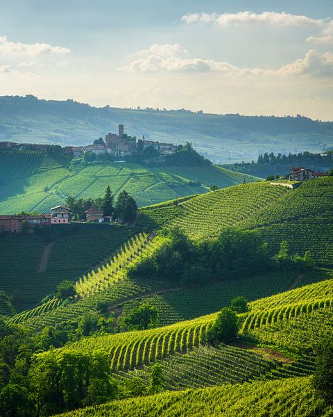 Langhe-Hügel, Weinberge und das Dorf Castiglione Falletto auf dem Gipfel des Hügels. Unesco-Welterbestätte, Region Piemont, Italien, Europa.