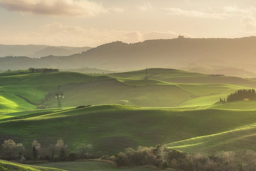 Ländliche Landschaft, sanfte Hügel, kleiner See, Zypressen und Olivenbäume bei Sonnenaufgang. Volterra, Region Toskana, Italien, Europa