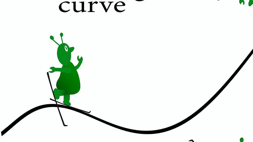 Illustration. Grüntyers erlernen das Skifahren auf einer Lernkurve Chart.
