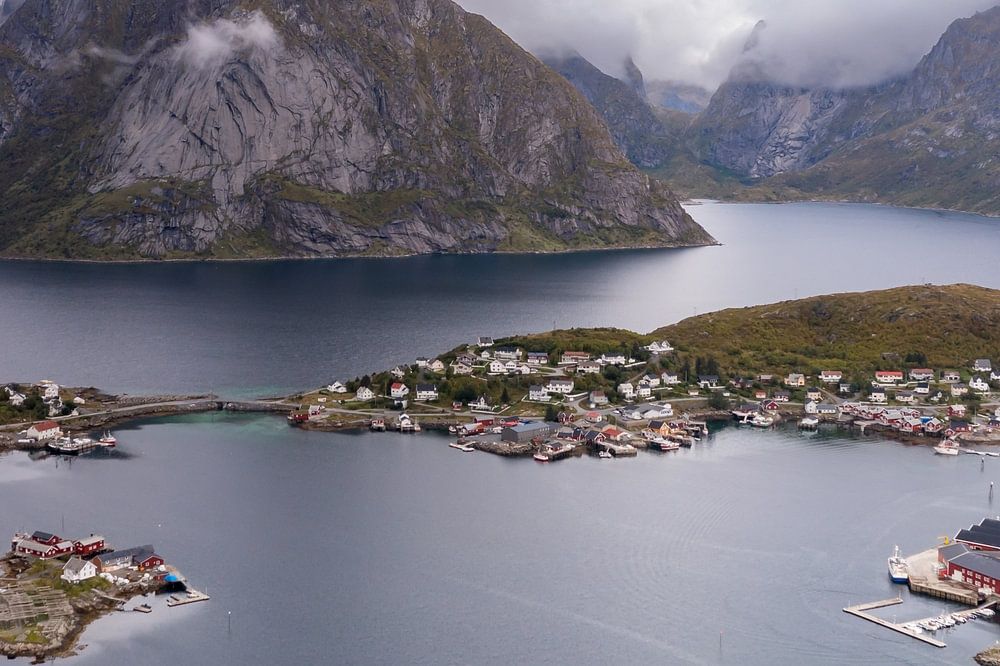 Die Inselchen der Lofoten mit den bunten Häuschen auf Stelzen, die im Meerwasser stehen. Die Eilande sind durch zahlreiche Brücken miteinander verbunden.