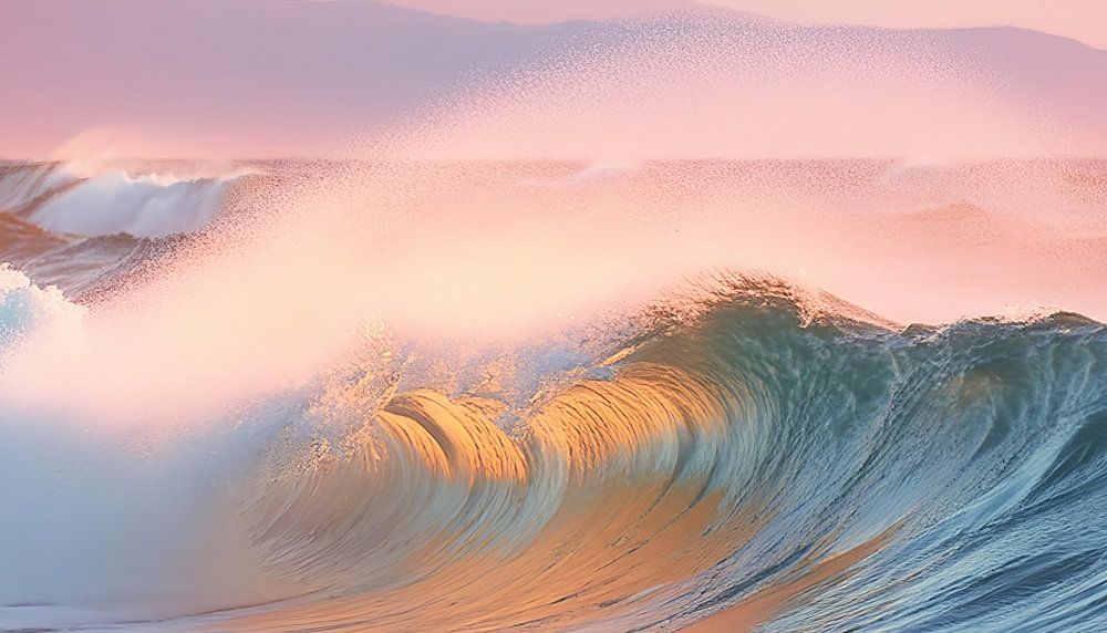 Erleben Sie die beeindruckende Kraft und Schönheit des Meeres mit diesem atemberaubenden Print. Das Bild zeigt mächtige Wellen, die im Licht des Sonnenuntergangs leuchten, während der Himmel in sanften Rosa- und Orangetönen erstrahlt. Diese dynamische Szene fängt die Essenz der natürlichen Pracht und Energie des Ozeans ein.