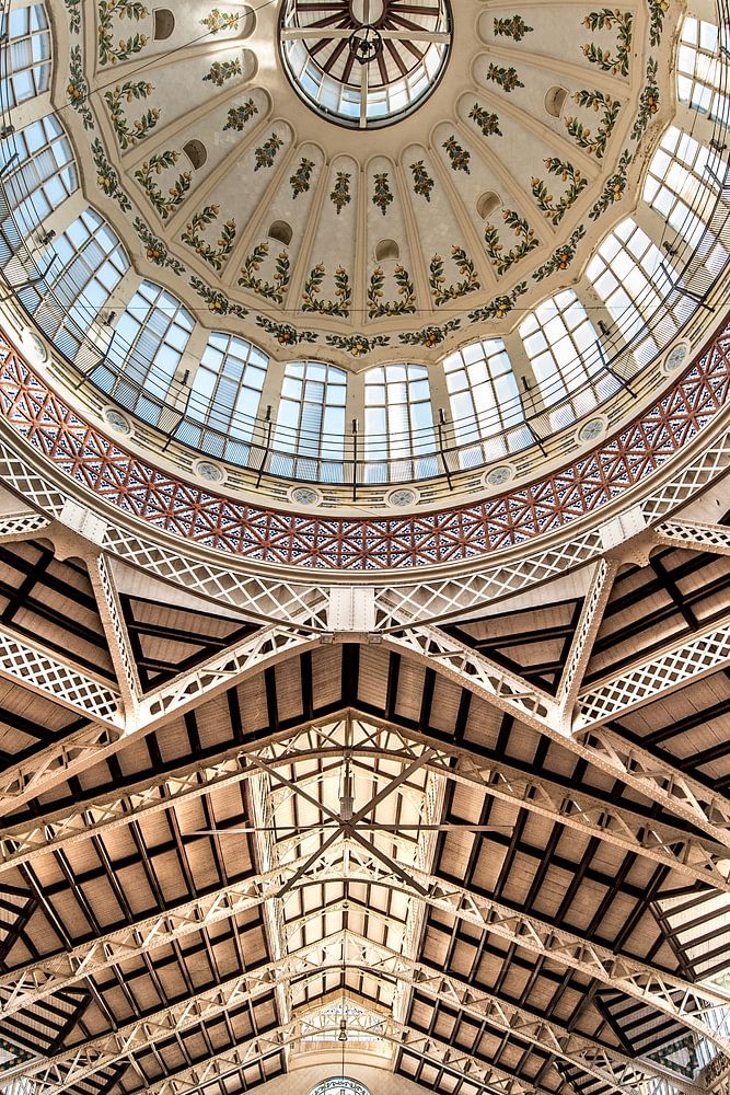 Die Markthalle von Valencia in Spanien hat eine beeindruckende und hohe Decke mit vielen geometrischen Formen und Oberlichtern.