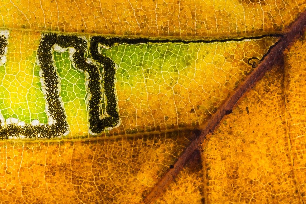 Der Buchenminiermottenkäfer legt seine Eier in den Blättern von Buchen ab. Aus diesen Eiern schlüpfen winzige Larven, die dann einen Gang im Blattgrün fressen. Der Durchgang beginnt klein, denn dort ist die Larve noch klein. Je mehr sie frisst, desto mehr wächst sie und desto größer wird der Korridor. In dieser Szene entstehen schöne und ungewöhnliche Fotos!