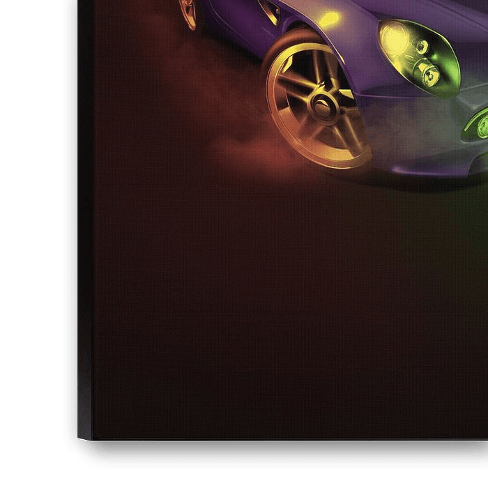 Ein lebendiger Alfa Romeo Sportwagen, der in surreales neongrünes und rotes Licht getaucht ist, scheint mit hoher Geschwindigkeit durch eine rauchige Dunkelheit zu fahren. Diese stilisierte Illustration fängt die pure, elektrische Energie ein.