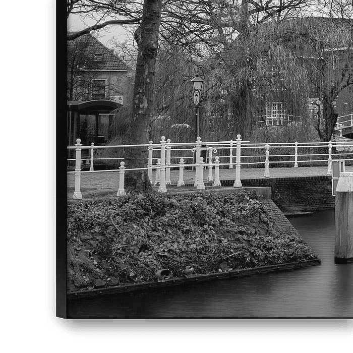 Das Osttor ist das einzige erhaltene historische Eingang der niederländischen Stadt Delft . Das Tor wird um 1400 gebaut, die beiden Türme sind im Jahr 1600 erhöht. Das Osttor besteht aus einer Land- und einer Wassertor, die durch eine Mauer verbunden sind. Die weiße Brücke ist eine malerische Zugbrücke aus Eisen und Holz. Mit die Metallgeländer und alten Straßenlaternen macht es ein rustikales Bild . Das Tor ist Teil der Delft Kanal und verbindet den Rhein- Schie -Kanal mit mehreren Kanälen, wie der südlichen Kanal. Dieses Foto ist Teil einer Reihe von Schwarz-Weiß- Fotografie mit niederländischen Dörfer und Städten.