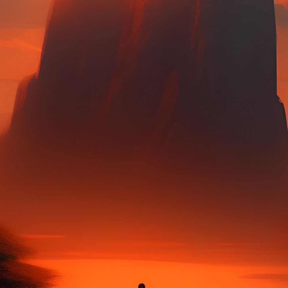 Am Fuße des Berges steht ein einsamer Mann, der seinen Blick auf den Gipfel und den sich dahinter entfaltenden Sonnenuntergang gerichtet hat. Er scheint der Wächter dieses bezaubernden Schauspiels zu sein, der Zeuge eines Übergangsmoments zwischen Tag und Nacht.