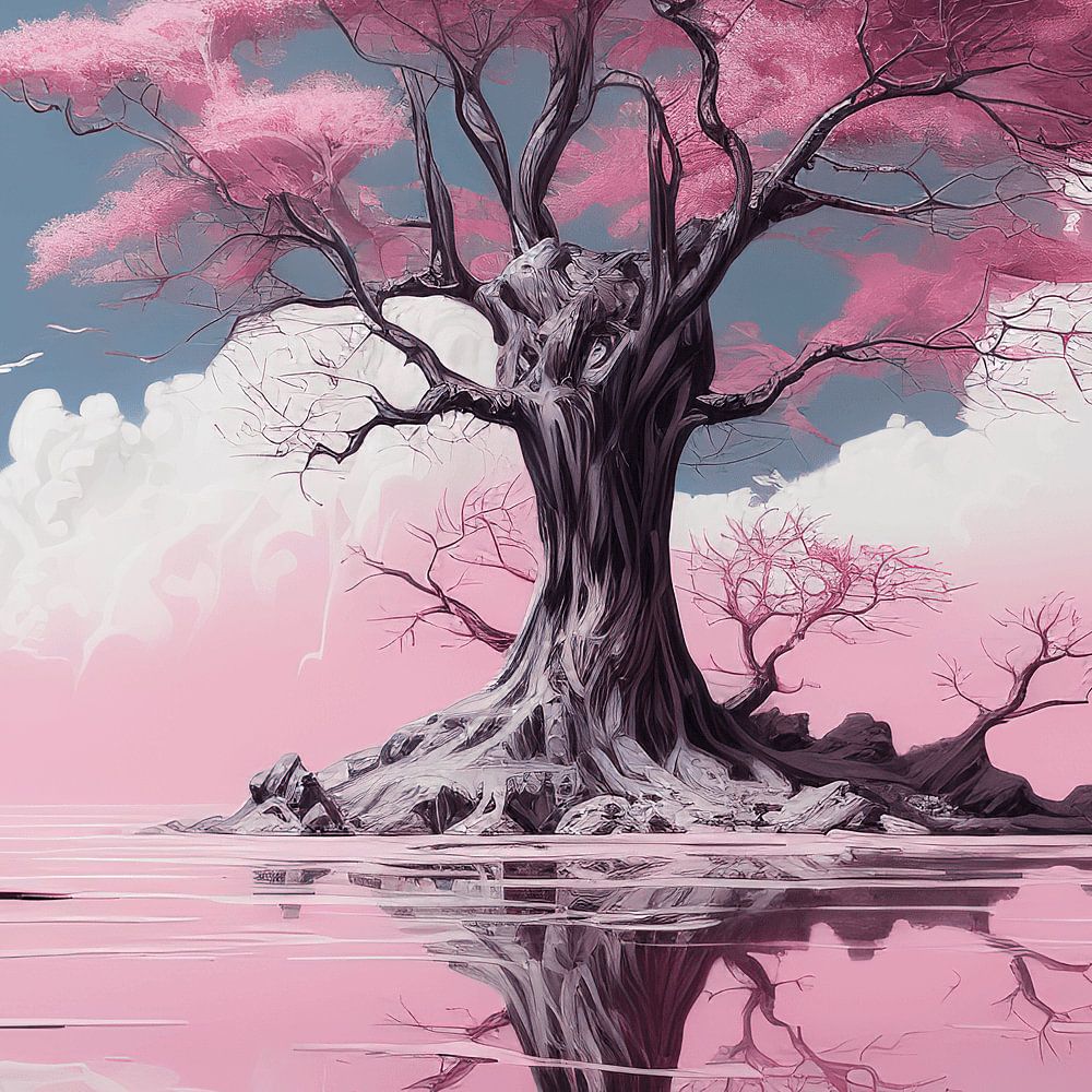 Eine digitale Kunstwerk, das eine surreale Szene zeigt, in der eine Person auf einen rosa Baum auf einer Insel zugeht. Der Baum spiegelt sich im Wasser und der Himmel ist rosa mit Wolken. Das Kunstwerk vermittelt ein Gefühl von Staunen und Neugier.