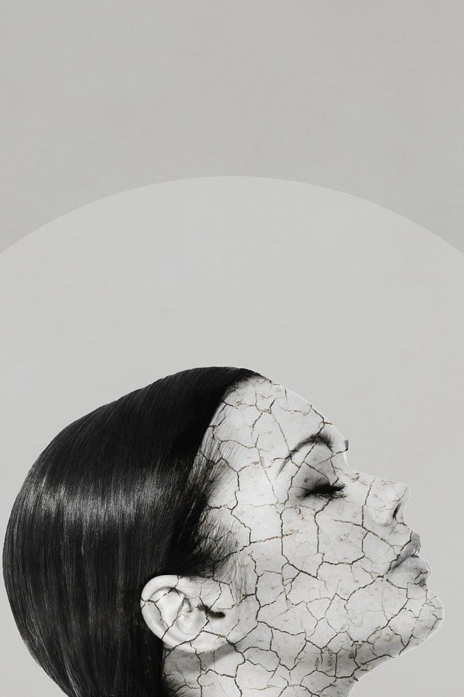 Ein surrealistischer Druck mit einem Porträt einer Frau in Grautönen.