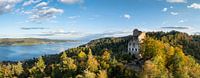 Die Burgruine Altbodman auf den Bodanrück mit Blick über den Überlinger See. Die tiefstehende Sonne streift mit ihrem warmen Licht über die bereits herbstlich bunt gefärbten Wälder. Ein milder Herbstnchmittag neigt sich dem Ende zu.