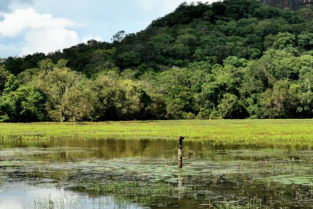 Unter einem azurblauen Himmel erheben sich die majestätischen Ruinen der Festung von Sigiriya auf einer Granitkuppe, wobei ihr perfektes Spiegelbild vom ruhigen Wasser der umliegenden Teiche eingefangen wird. Ein atemberaubender Anblick, bei dem sich Vergangenheit und Gegenwart in einem Spiegelbild zu begegnen scheinen.