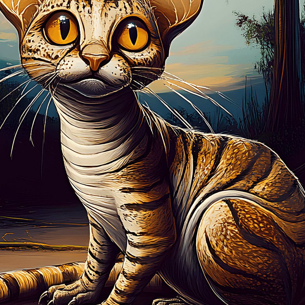 Im Herzen eines uralten und mystischen Sumpfes sitzt eine Kreatur von unvergleichlicher Eleganz, deren goldene Augen mit rätselhafter Weisheit glänzen. Als perfekte Verschmelzung von katzenartiger Anmut und schlangenartiger Mystik ist dieses Wesen sowohl Wächter als auch Illusionist, wobei sein langer, gewundener Schwanz eine verborgene Macht andeutet. Die filigranen, tigerähnlichen Muster auf seinem Fell fügen sich nahtlos in die wilde, ungezähmte Umgebung ein und machen ihn zu einem wahren Wunderwerk der Natur.