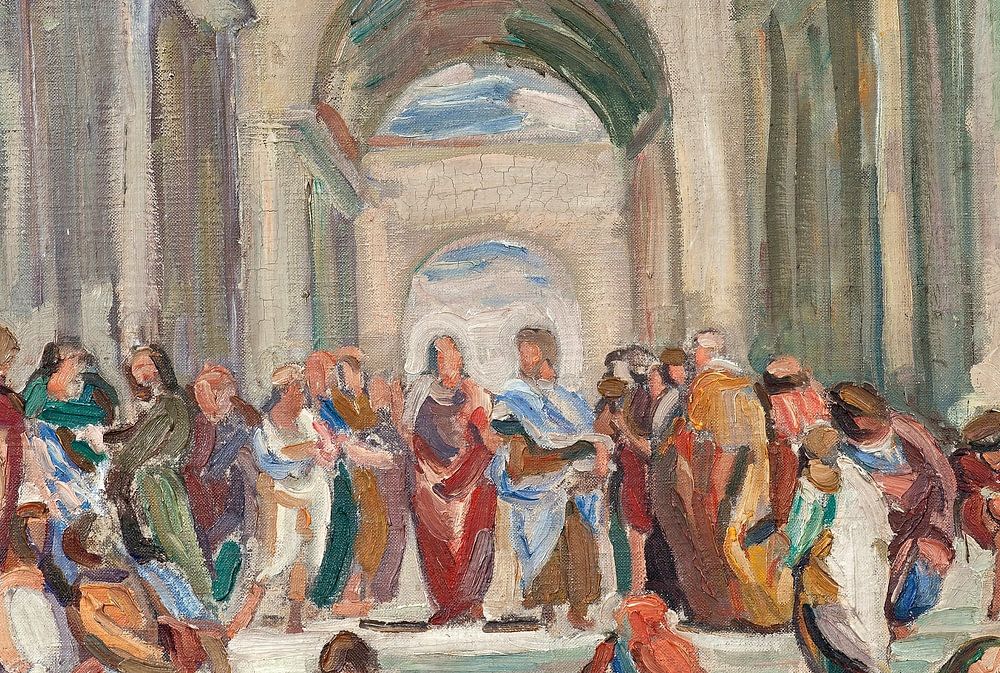 In diesem Gemälde hat J.A. Jerichau versucht, die Essenz von Raffaels Die Schule von Athen durch eine modernistische Linse mit begrenzten, breiten Pinselstrichen einzufangen. Er vollendete das Gemälde, als er noch Student an der Königlichen Kunstakademie Dänemarks war.