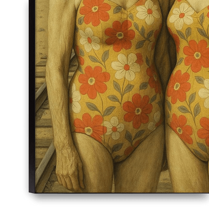 Auf diesem surrealistischen Gemälde stehen zwei ältere, fast identische Frauen in Badeanzügen aus den 1950er Jahren an einer verlassenen Bahnstrecke in der Wüste. Die rote Sonnenbrille, die geblümte Badekappe und die strenge Körperhaltung verleihen dem Bild einen Hauch von Humor,…