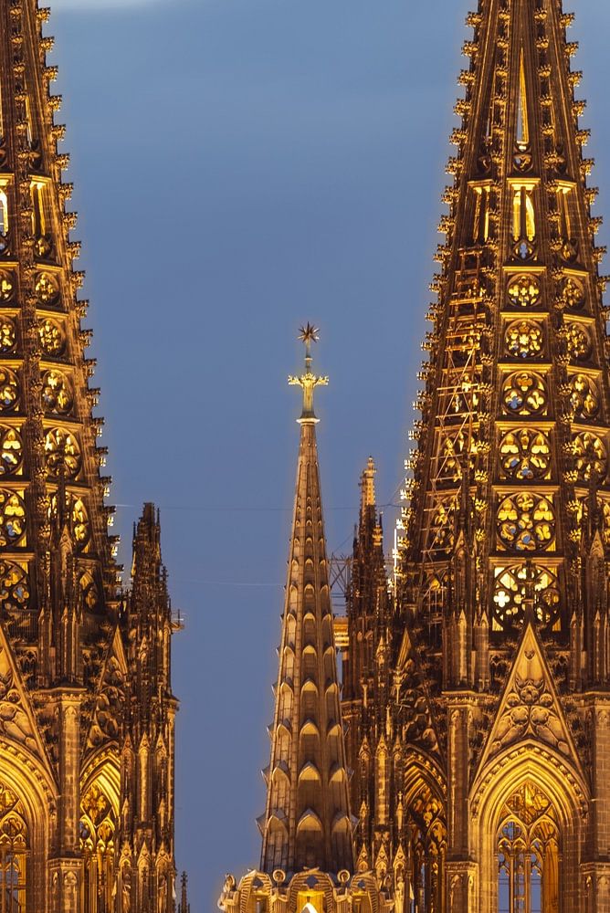 Im goldenen Schein der Nacht erhebt sich der Kölner Dom wie ein steinernes Gedicht gegen den Himmel – majestätisch, ehrwürdig, leuchtend. Seine filigranen Türme, von zahllosen LED-Leuchtmitteln in warmes Licht getaucht, durchbohren die blaue Dämmerung wie Fackeln der Ewigkeit. Jeder Bogen, jedes Maßwerk erzählt von Jahrhunderten des Glaubens, der Hoffnung, der Menschlichkeit – eingefroren in gotischer Pracht.