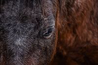 Eine intime Nahaufnahme eines Pferdes, bei der der Fokus auf der weichen Textur des Fells und der Tiefe des Auges liegt. Die erdigen Farbtöne und die scharfen Details machen dieses Bild zu einem kraftvollen und emotionalen Kunstwerk für Pferdeliebhaber.