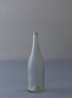 Eine leere Flasche, fotografiert vor einem graublauen Hintergrund und einer hellgrauen Wand. Links von der Flasche befindet sich ein großes Fenster, vor dem Schnee liegt. Das Licht des Schnees reflektiert auf der Flasche. Indirekt, weil zwischen dem Licht und der Flasche ein Glasvorhang hängt, der das Licht abschwächt. Reines Foto einer…