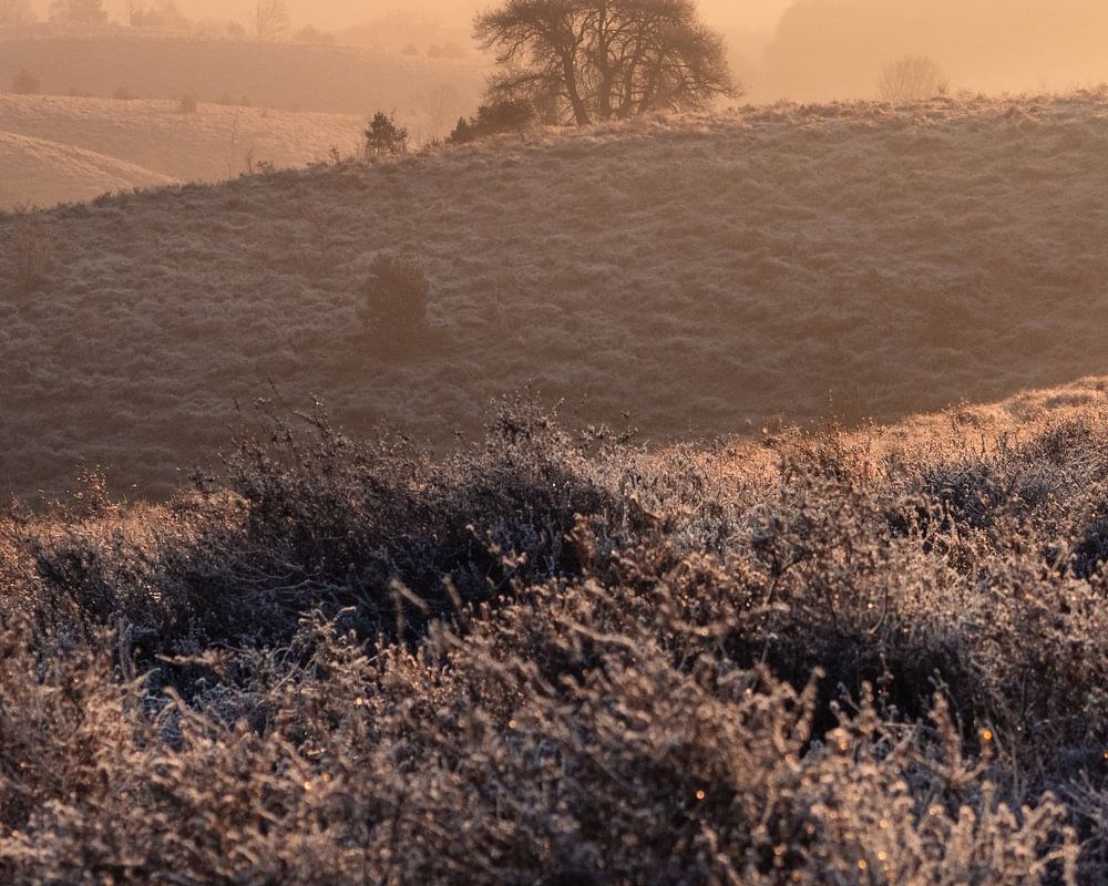 Wenn die Sonne aufgeht, entsteht ein wunderschönes, mattes Leuchten in Richtung der Sonne. Das spiegelt sich im Glitzern des gefrorenen Tauwetters auf der Heide wider. So entsteht eine märchenhafte Kulisse in der Heidelandschaft des Veluwezooms.
