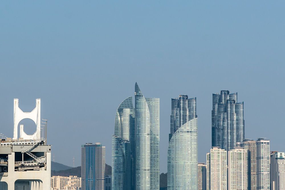 Die Skyline von Busan an einem sonnigen Wintertag. Diese koreanische Stadt liegt im Süden Südkoreas am Meer.