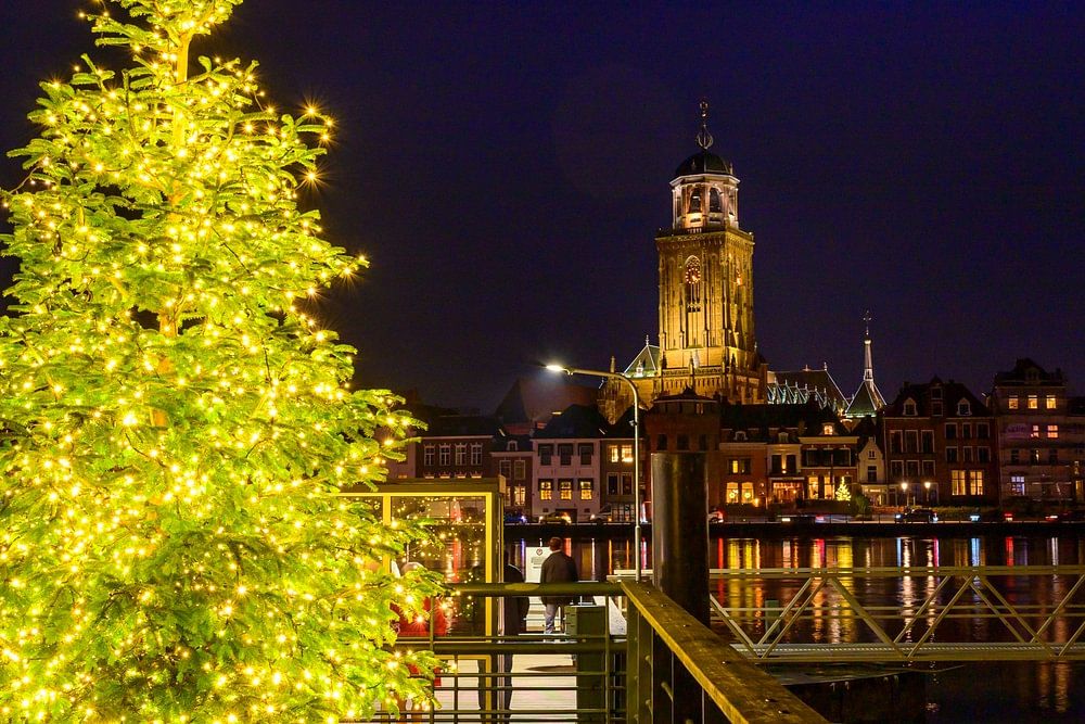 Nächtlicher Blick auf die Stadt Deventer am Ufer des Flusses IJssel in Overijssel, Niederlande, in den dunklen Dezembertagen vor Weihnachten. Der Turm der St. Lebuinus-Kirche oder großen Kirche ist ein Wahrzeichen im Stadtzentrum.