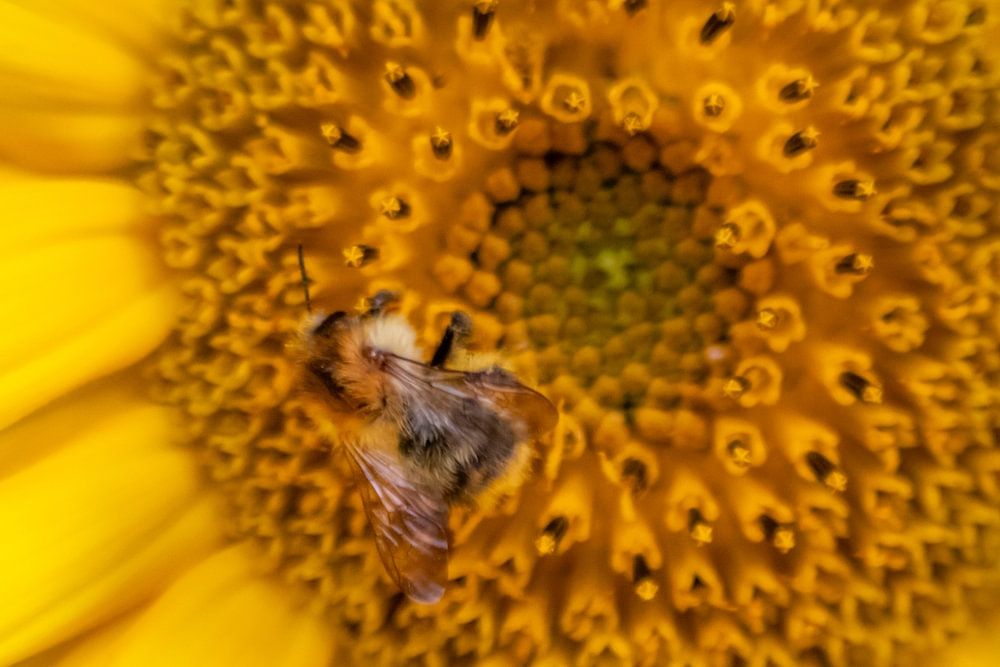 Fleißige Biene sammelt Pollen auf einer wunderschönen Sonnenblume in voller Blütenpracht.