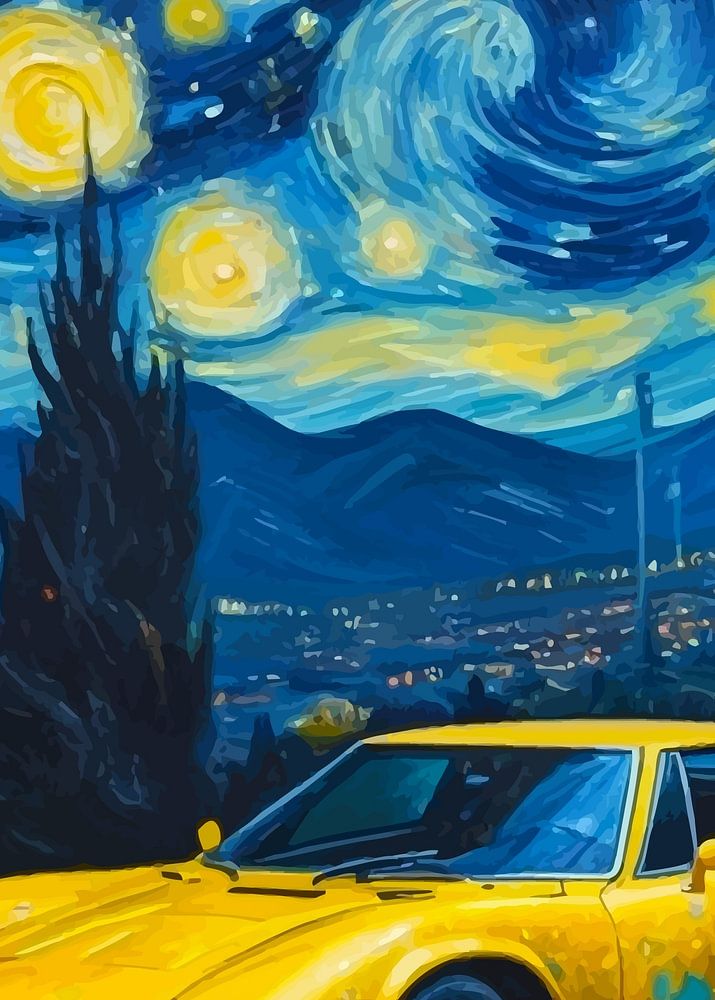 Die Miura liegt still unter einem Sternenhimmel, ihre Kurven spiegeln den sanften Fluss von Van Goghs himmlischen Winden wider. Goldene Sterne schweben darüber wie Juwelen, während seine organische Form mit malerischer Bewegung verschmilzt. Die Szene fängt nicht nur die Schönheit des Autos ein, sondern auch die gefühlvolle Harmonie zwischen Design, Farbe und zeitloser Nacht.