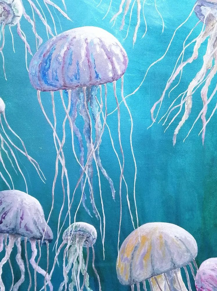 Diese Acrylmalerei zeigt die Ruhe, die schwebende Quallen unter Wasser ausstrahlen, während sie vom Licht der Oberfläche bestrahlt werden. Ein beruhigendes und meditatives Motiv.