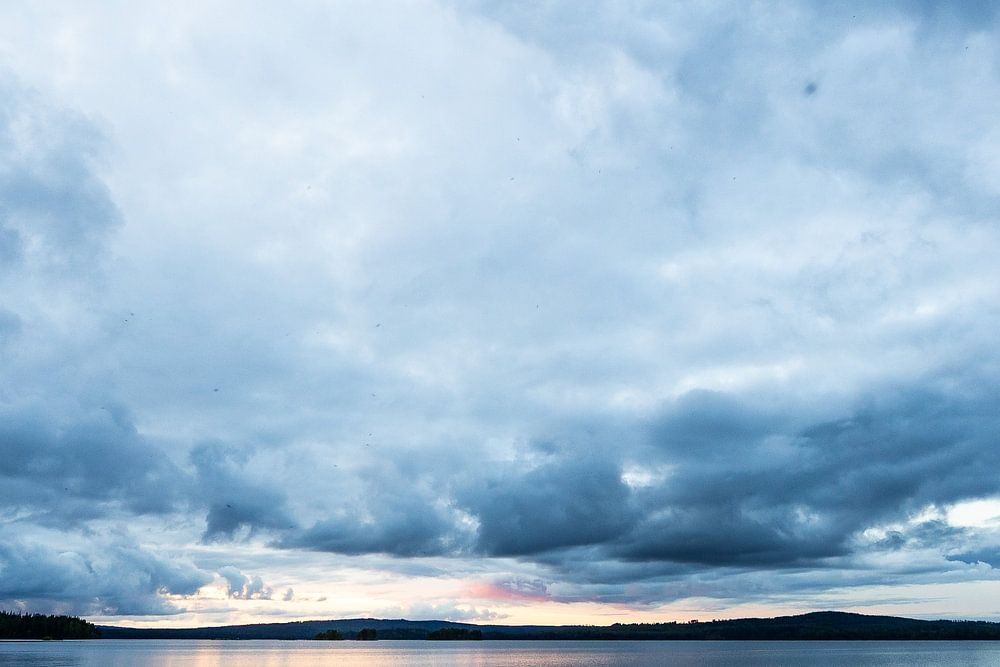 Tief in der schwedischen Landschaft, wo sich Wälder an Seen schmiegen und die Stille eine eigene Sprache spricht, tut sich dieses beeindruckende Schauspiel auf. Der Himmel ist schwer und lebendig, gefüllt mit Wolken, die sich wie Gedankenwellen bewegen - bedrohlich, aber nicht ohne Schönheit. Über dem ruhigen Wasser eines großen Sees spiegelt sich der Himmel in kühlen Blautönen, fast so, als würde die Natur ihr eigenes Spiegelbild betrachten.