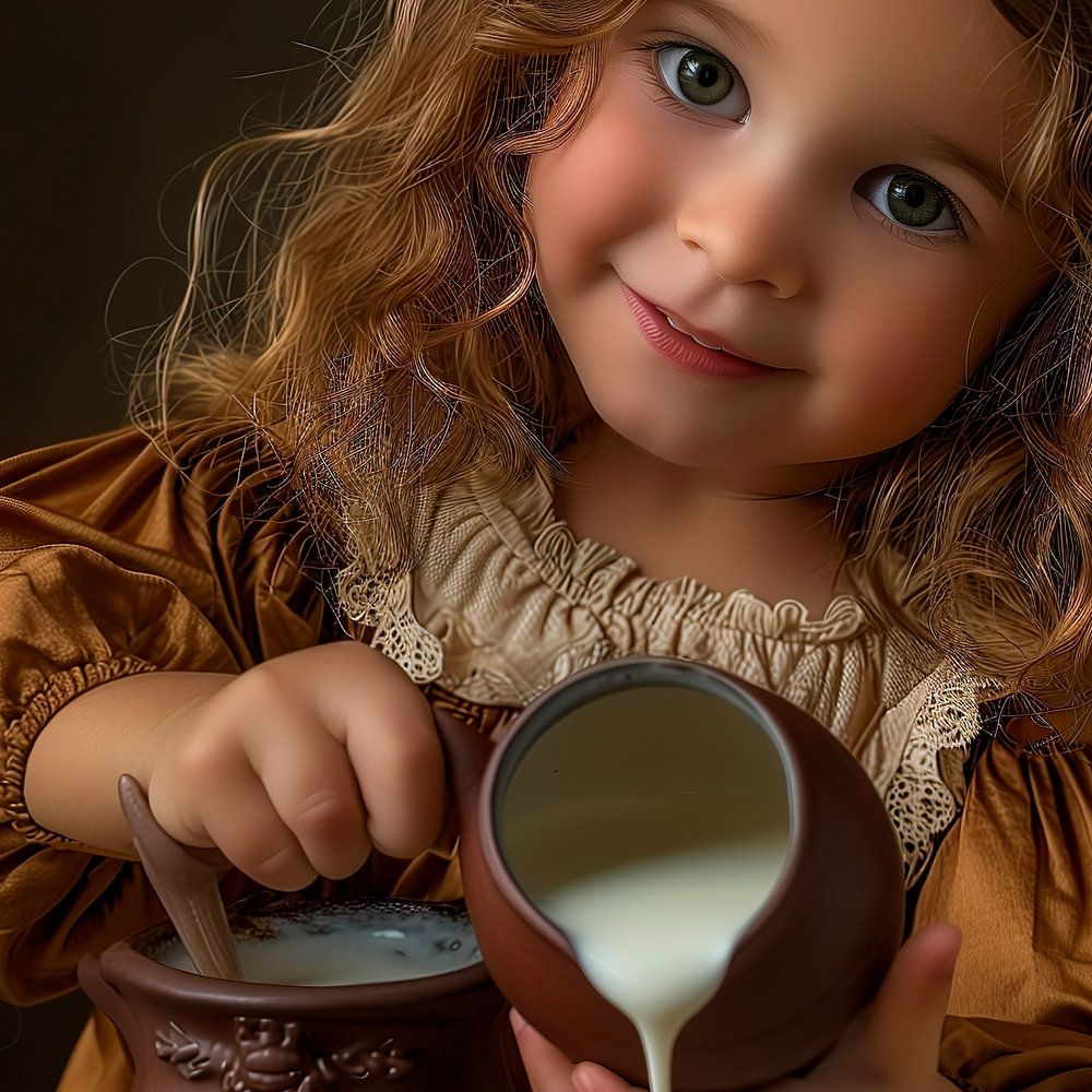 Die Tochter des Milchmädchens von Johannes Vermeer. Ihre Aufmerksamkeit ist nicht auf das Einschenken gerichtet, sie braucht noch viel Übung.