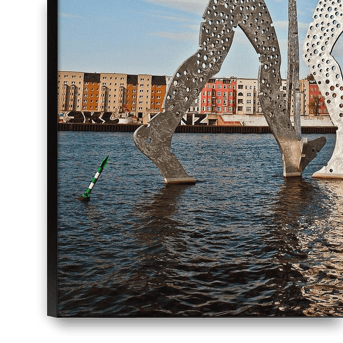 Bestelle das Foto Die Wasserstatue Molecule Man an der Berliner Spree von Silva Wischeropp als Reproduktion auf Leinwand, Alu-Dibond, als Poster, Fototapete oder Acrylglasbild.