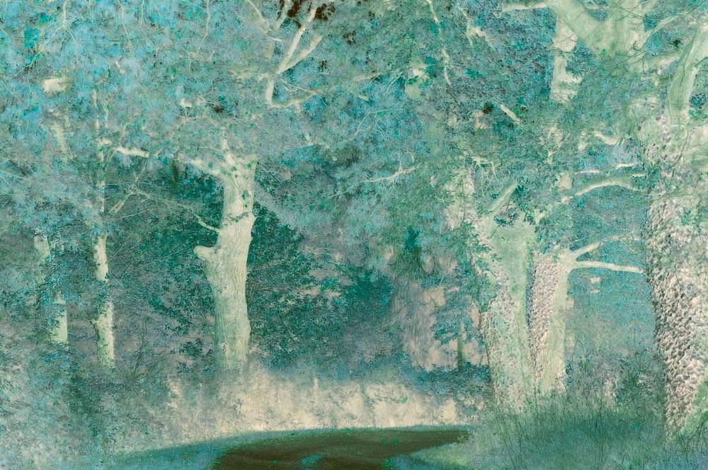 Eine digitale Fotobearbeitung eines Waldwegs, der um eine Kurve führt. Es ist von Eichen umgeben. Die ganze Szene wurde im Negativ aufgenommen. Ich habe dann die Farben bearbeitet, um ein magisches Bild zu erzeugen. Wenn Sie es mögen.