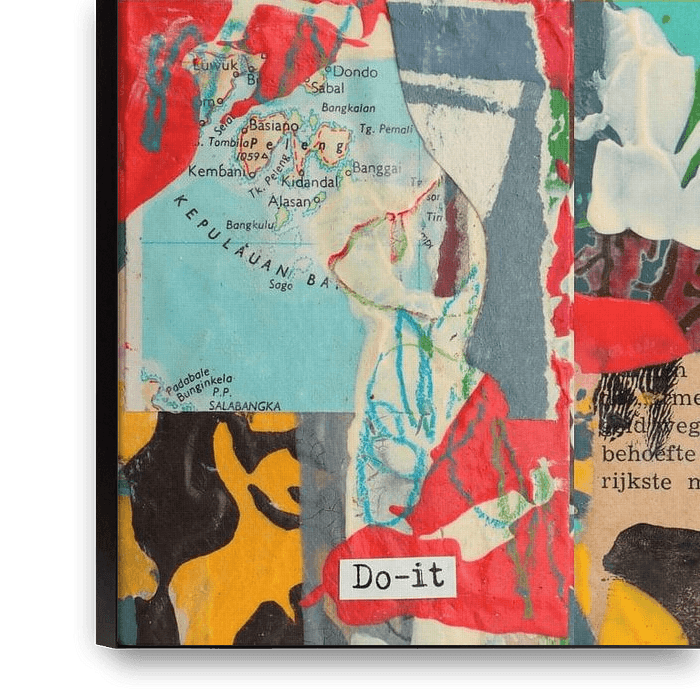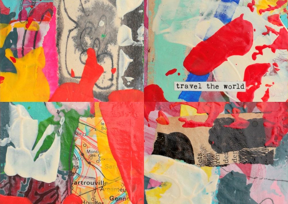 Farbenfrohe Collage aus handgefertigten Collagen-Kunstkarten. Bei dieser Collage geht es darum, Grenzen zu überschreiten – im wörtlichen wie im übertragenen Sinne. Du kannst um die Welt reisen oder deine persönlichen Grenzen erweitern, indem du neue Dinge erschaffst oder neue Pläne schmiedest. Hier geschieht das Wunder!
